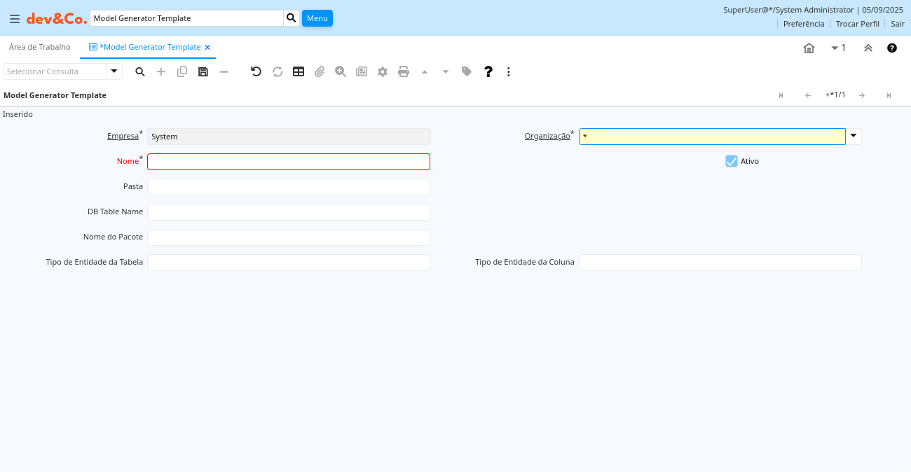 | Nome do Pacote | ad_modelgeneratortemplate.PackageName character varying(60) String | ||
