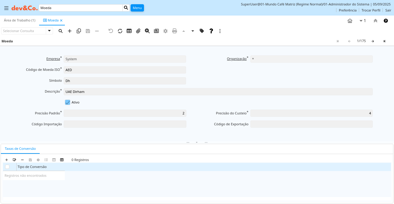 | Ativo | O registro está ativo no sistema | Existem dois métodos de tornar um registro indisponível no sistema: O primeiro é excluir o registro, o outro é desativar o registro. Um registro desativado não está disponível para seleção, mas está disponível para relatórios. Existem duas razões para desativar um registro ao invés de excluí-lo: (1) O sistema exige o registro para fins de auditoria. (2) O registro é referenciado por outros registros. Ex. você não pode excluir um Parceiro de Negócios, se existirem faturas para este parceiro de negócios. Você desativa o Parceiro de Negócios e previne que este registro seja usado para entradas futuras. | c_currency_trl.IsActive character(1) Yes-No |
