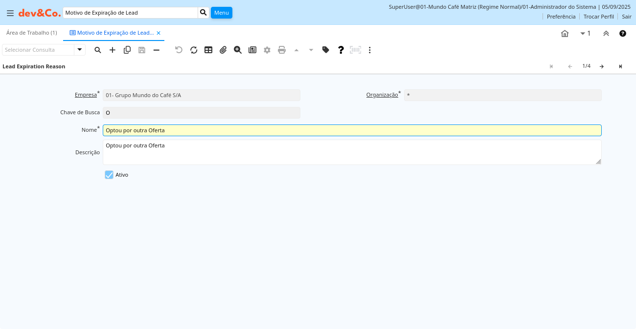 | Chave de Busca | Chave de pesquisa para o registro no formato necessário - tem que ser único e exclusivo | Uma "Chave de Busca" fornece a você um método rápido de encontrar um registro em particular. Se você deixar a chave de busca vazia, o sistema automaticamente cria um valor numérico. A seqüência de documento usada por este número de recuperação é definida na janela "Gerenciamento de Seqüência" com o nome "DocumentNo_", onde TableName é o nome real da tabela (ex: C_Order). | cof_c_leadexpirationreason.Value character varying(40) String |