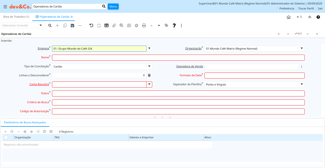 | Critério de Busca | Campo destinado para inserir TAGS separadas por ponto e virgula | Insira TAGS referentes às colunas da planilha a ser importada da operadora de cartão separadas por ponto e virgula, para serem critério de busca para buscar os documentos no sistema ao importar a planilha | cof_operadorascartao.COF_CriterioBusca character varying(255) String |