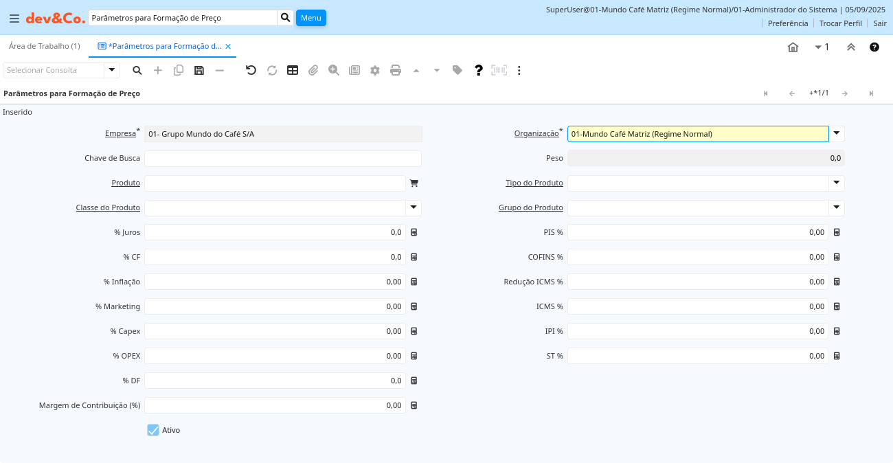 | Ativo | O registro está ativo no sistema | Existem dois métodos de tornar um registro indisponível no sistema: O primeiro é excluir o registro, o outro é desativar o registro. Um registro desativado não está disponível para seleção, mas está disponível para relatórios. Existem duas razões para desativar um registro ao invés de excluí-lo: (1) O sistema exige o registro para fins de auditoria. (2) O registro é referenciado por outros registros. Ex. você não pode excluir um Parceiro de Negócios, se existirem faturas para este parceiro de negócios. Você desativa o Parceiro de Negócios e previne que este registro seja usado para entradas futuras. | cof_paramformacaopreco.IsActive character(1) Yes-No |