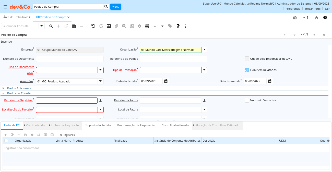 Ajuda: A Janela "Pedido de Compra" define um pedido de compra para uma organização. Quando um Pedido de Compra tiver sido digitado você pode gerar um Documento de Remessa ou Fatura a partir deste Pedido de Compra