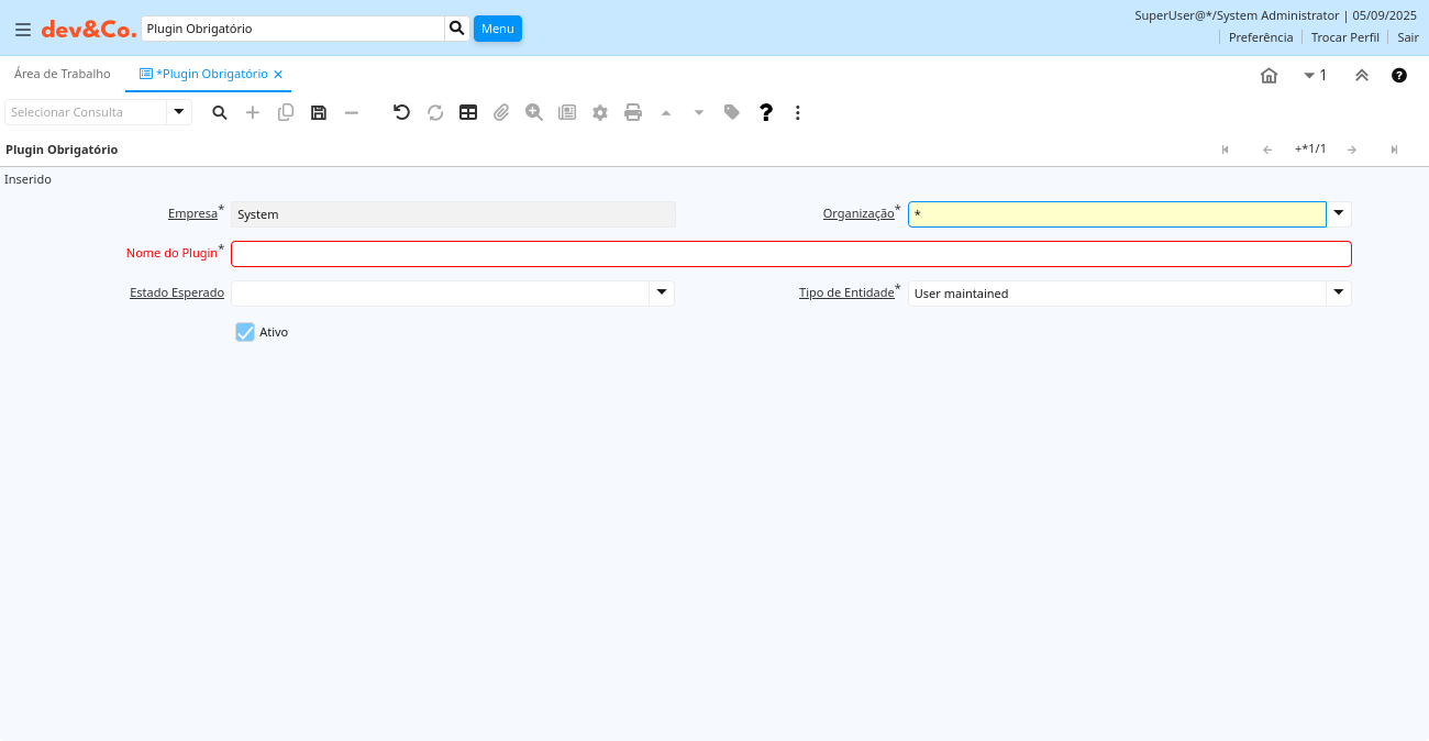 | Ativo | O registro está ativo no sistema | Existem dois métodos de tornar um registro indisponível no sistema: O primeiro é excluir o registro, o outro é desativar o registro. Um registro desativado não está disponível para seleção, mas está disponível para relatórios. Existem duas razões para desativar um registro ao invés de excluí-lo: (1) O sistema exige o registro para fins de auditoria. (2) O registro é referenciado por outros registros. Ex. você não pode excluir um Parceiro de Negócios, se existirem faturas para este parceiro de negócios. Você desativa o Parceiro de Negócios e previne que este registro seja usado para entradas futuras. | ad_requiredplugin.IsActive character(1) Yes-No |