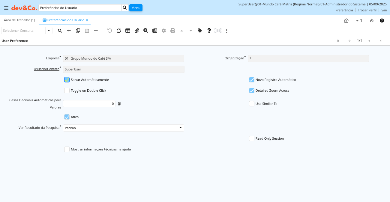 | Salvar Automáticamente | Caso marcado alterações em janelas são automaticamente salvas ao trocar o registro | ad_userpreference.AutoCommit character(1) Yes-No | |