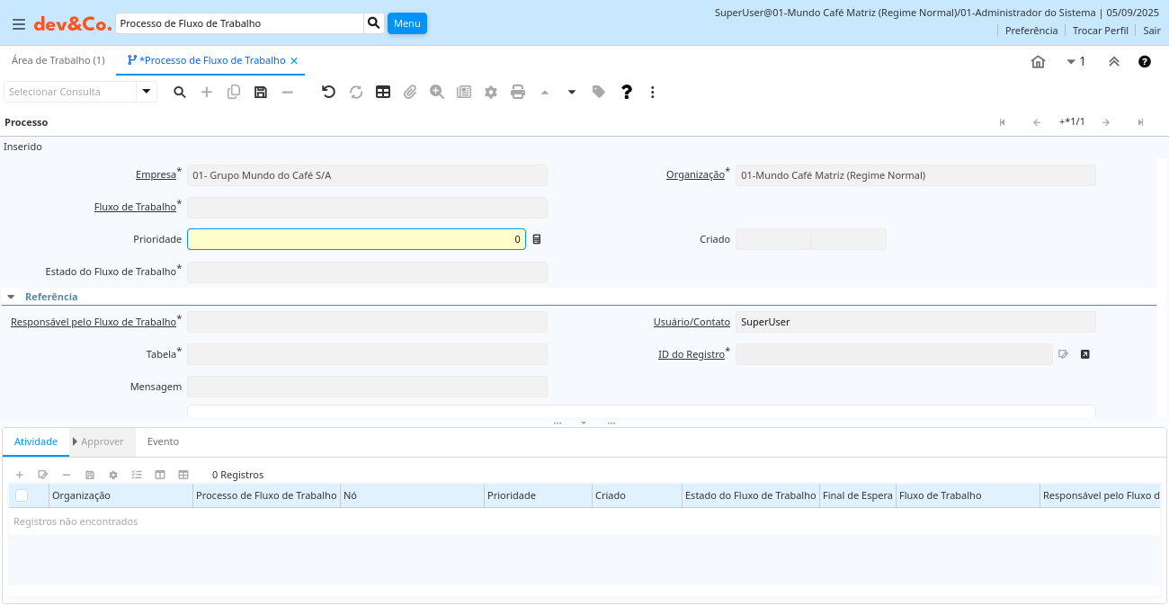 | Criado | Data de criação deste registro | O Campo "Criado" indica a data em que este registro foi criado. | ad_wf_activity.Created timestamp without time zone Date+Time |