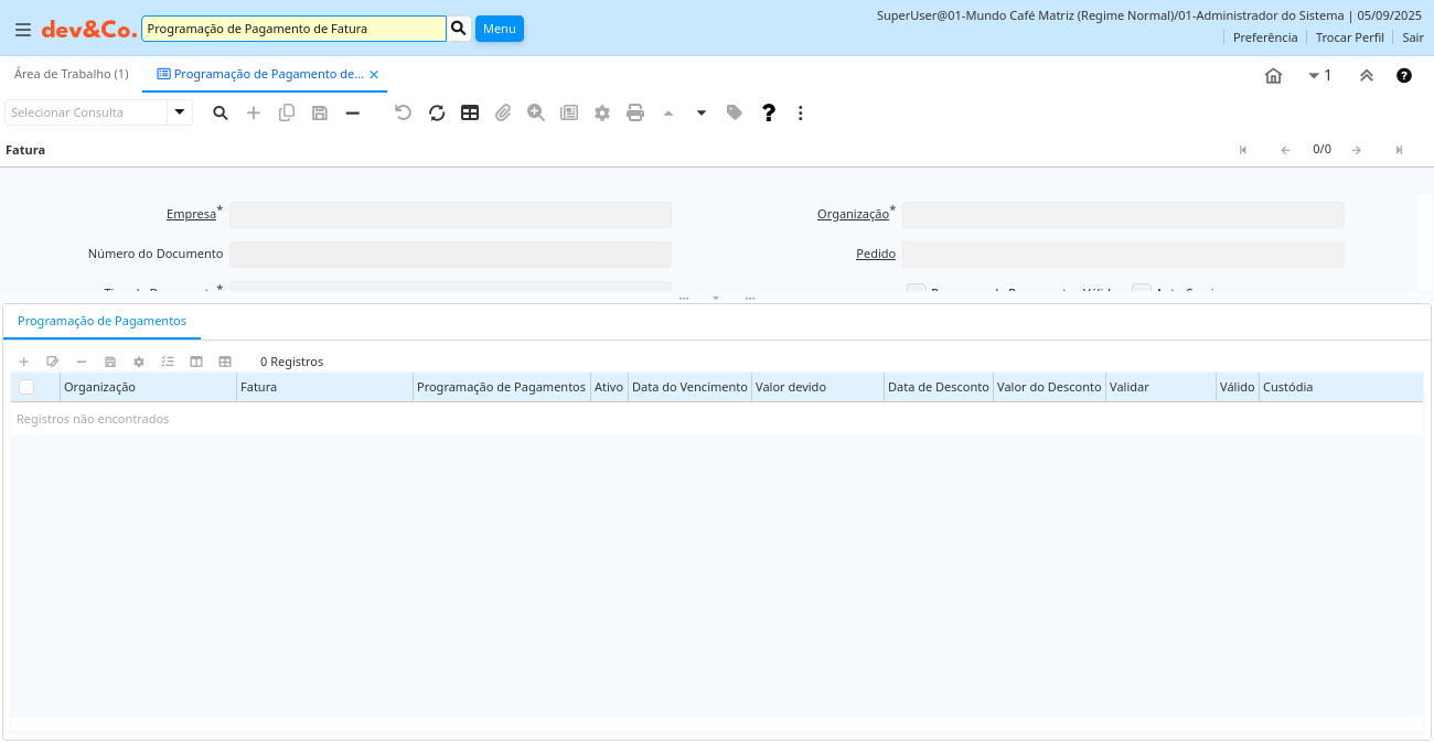 | Programa de Pagamentos Válido | A Programação de Pagamentos é válida | A "Programação de Pagamentos" permite a você ter múltiplas datas de vencimento. | c_invoice.IsPayScheduleValid character(1) Yes-No |