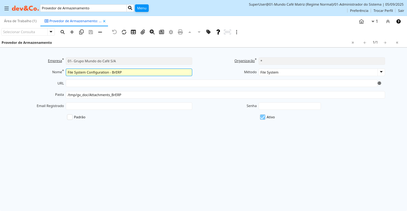 | Ativo | O registro está ativo no sistema | Existem dois métodos de tornar um registro indisponível no sistema: O primeiro é excluir o registro, o outro é desativar o registro. Um registro desativado não está disponível para seleção, mas está disponível para relatórios. Existem duas razões para desativar um registro ao invés de excluí-lo: (1) O sistema exige o registro para fins de auditoria. (2) O registro é referenciado por outros registros. Ex. você não pode excluir um Parceiro de Negócios, se existirem faturas para este parceiro de negócios. Você desativa o Parceiro de Negócios e previne que este registro seja usado para entradas futuras. | ad_storageprovider.IsActive character(1) Yes-No |