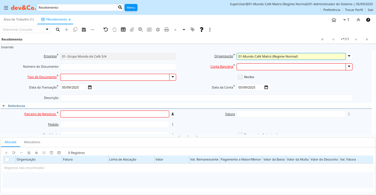 Ajuda: Enter payment or receipt for a Business Partner. If it is for a single invoice it can be allocated directly to that invoice using this screen. You can also apply over/under payments:
