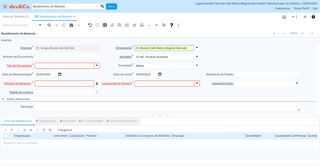 Ajuda: A Janela "Remessas de Fornecedores" define o recebimento de um produto ou material de um Fornecedor. A expedição pode ser digitada manualmente ou pode ser gerada a partir de um Pedido de Compra ou Fatura de Fornecedor.