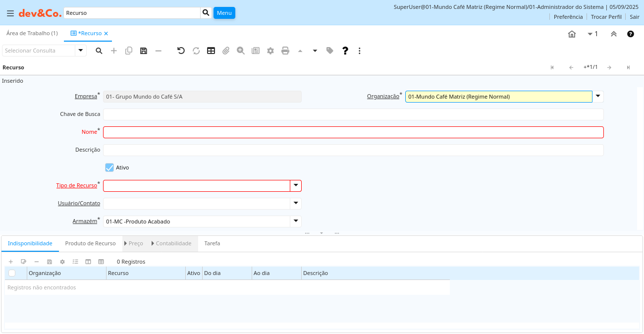 Ajuda: O Produto para o Recurso é automaticamente criado e sincronizado. Atualize Nome, Unidade de Medida, etc. no Recurso e não o altere no Produto.