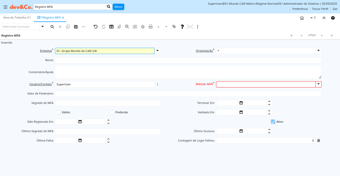 | Ativo | O registro está ativo no sistema | Existem dois métodos de tornar um registro indisponível no sistema: O primeiro é excluir o registro, o outro é desativar o registro. Um registro desativado não está disponível para seleção, mas está disponível para relatórios. Existem duas razões para desativar um registro ao invés de excluí-lo: (1) O sistema exige o registro para fins de auditoria. (2) O registro é referenciado por outros registros. Ex. você não pode excluir um Parceiro de Negócios, se existirem faturas para este parceiro de negócios. Você desativa o Parceiro de Negócios e previne que este registro seja usado para entradas futuras. | mfa_registration.IsActive character(1) Yes-No |