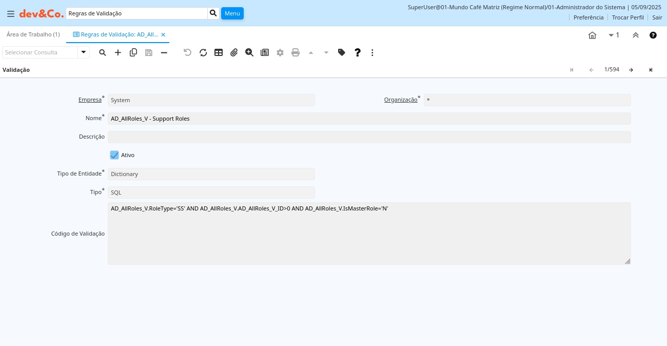 | Ativo | O registro está ativo no sistema | Existem dois métodos de tornar um registro indisponível no sistema: O primeiro é excluir o registro, o outro é desativar o registro. Um registro desativado não está disponível para seleção, mas está disponível para relatórios. Existem duas razões para desativar um registro ao invés de excluí-lo: (1) O sistema exige o registro para fins de auditoria. (2) O registro é referenciado por outros registros. Ex. você não pode excluir um Parceiro de Negócios, se existirem faturas para este parceiro de negócios. Você desativa o Parceiro de Negócios e previne que este registro seja usado para entradas futuras. | ad_val_rule.IsActive character(1) Yes-No |