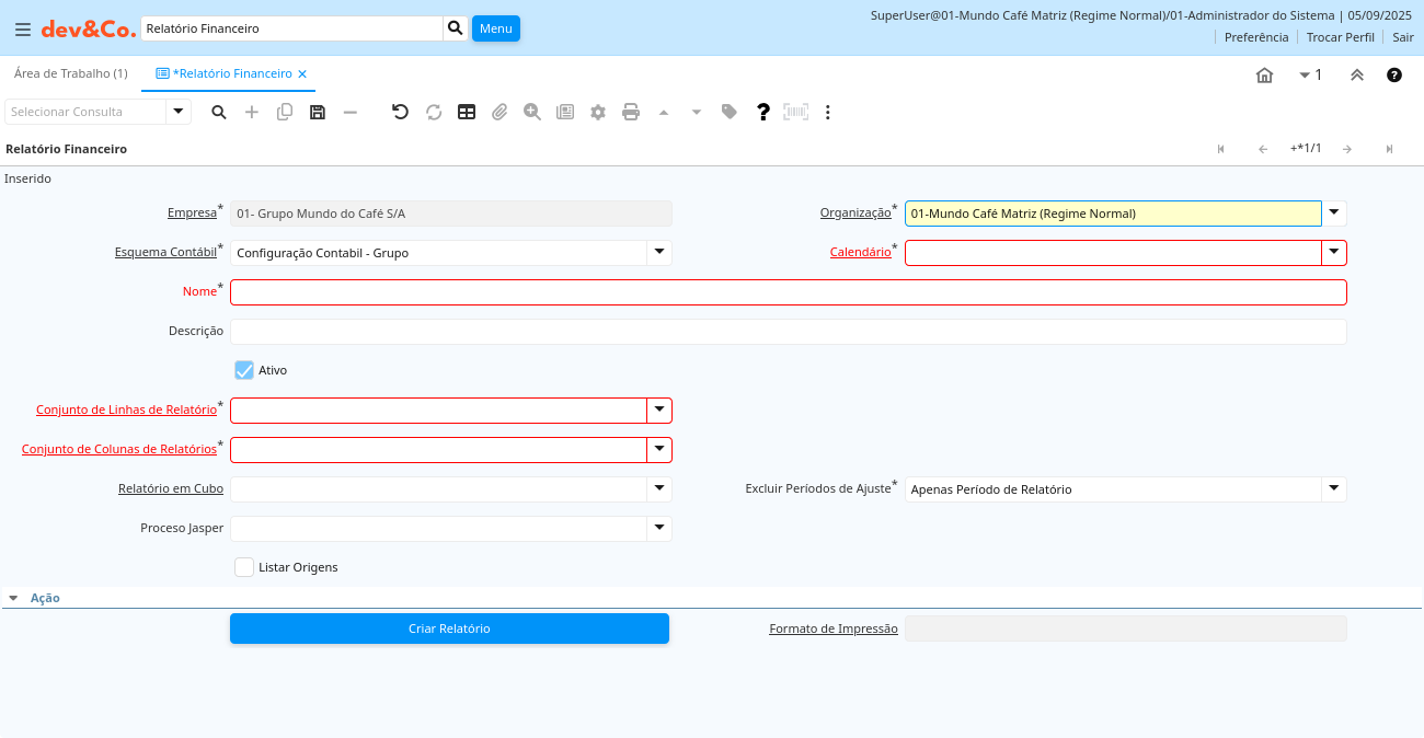 Ajuda: Relatórios Financeiros são a combinação de um Conjunto de Colunas e um Conjunto de Linhas de Relatório.