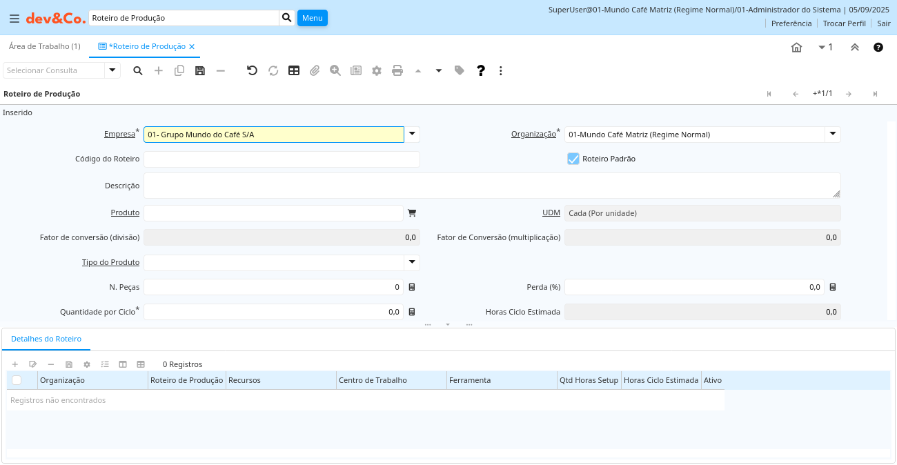 | Código do Roteiro | Chave de pesquisa para o registro no formato necessário - tem que ser único e exclusivo | cof_pp_roteiroprod.Value character varying(40) String | |