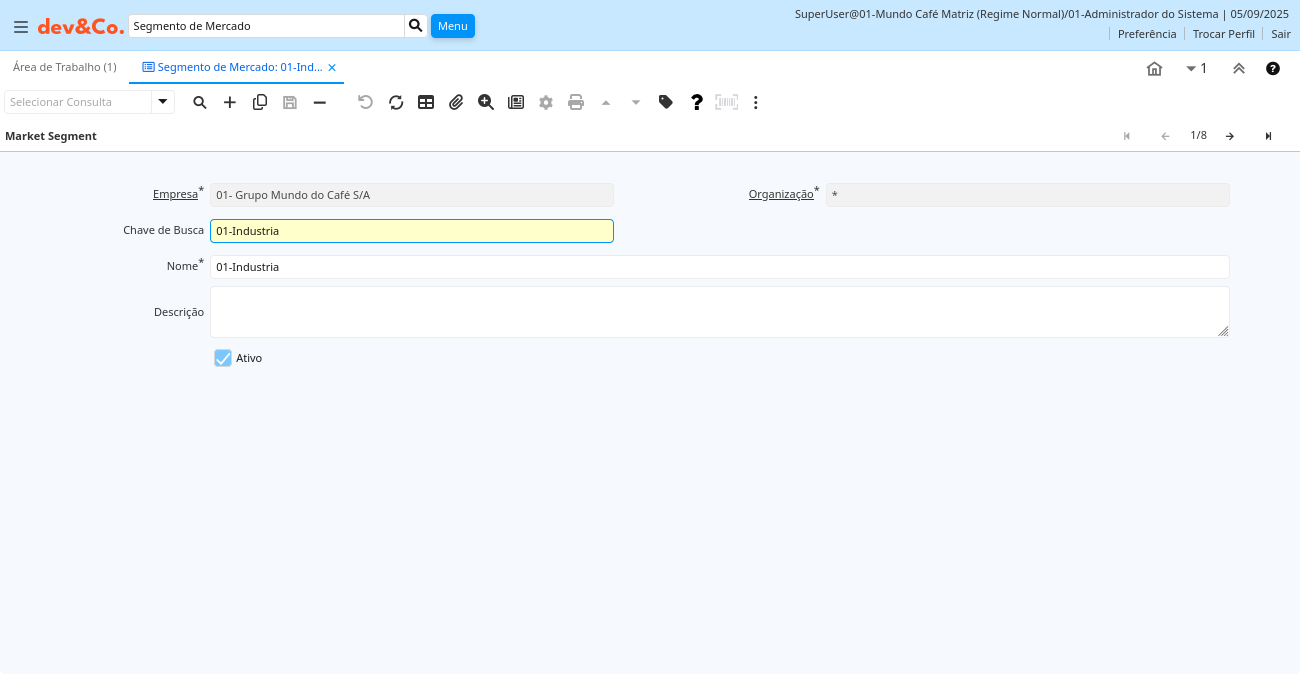 | Chave de Busca | Chave de pesquisa para o registro no formato necessário - tem que ser único e exclusivo | Uma "Chave de Busca" fornece a você um método rápido de encontrar um registro em particular. Se você deixar a chave de busca vazia, o sistema automaticamente cria um valor numérico. A seqüência de documento usada por este número de recuperação é definida na janela "Gerenciamento de Seqüência" com o nome "DocumentNo_", onde TableName é o nome real da tabela (ex: C_Order). | cof_c_marketsegment.Value character varying(40) String |