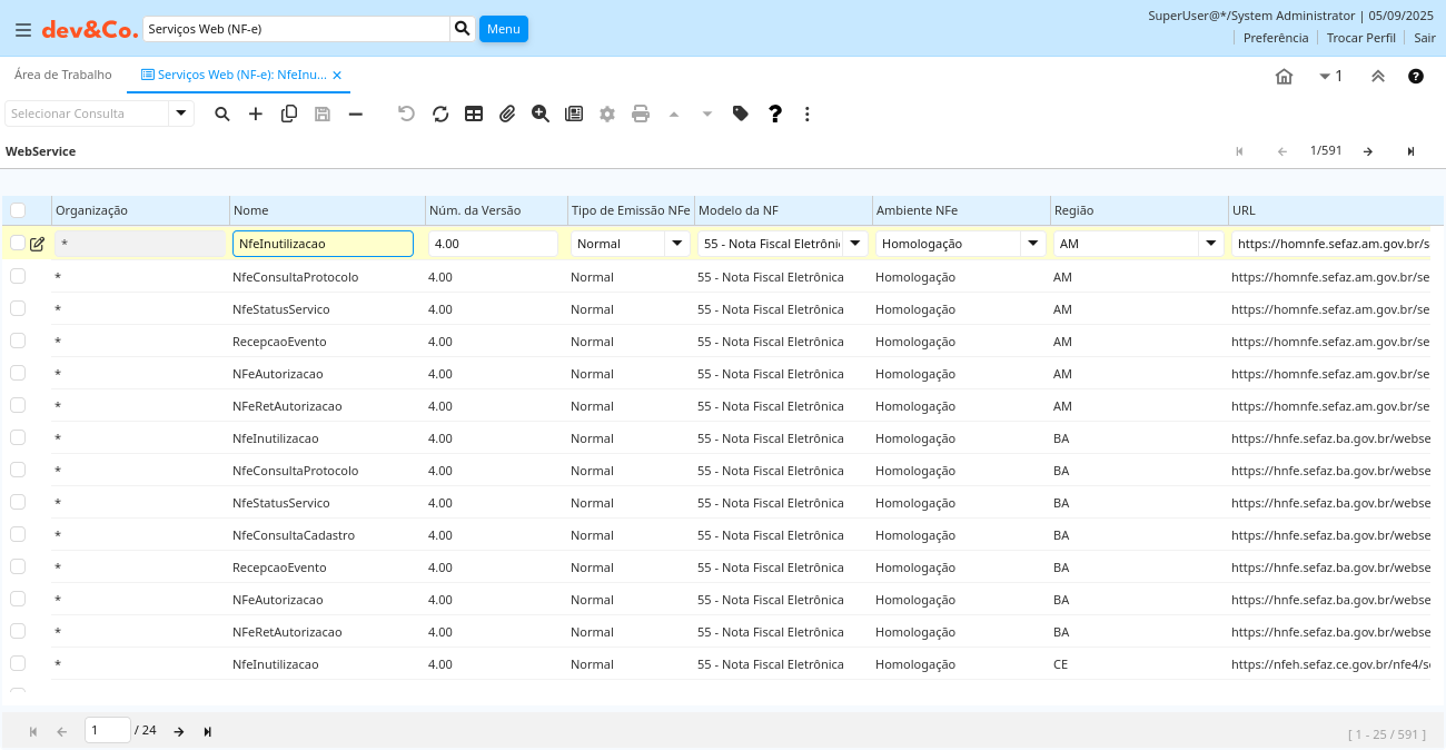 | Ativo | O registro está ativo no sistema | Existem dois métodos de tornar um registro indisponível no sistema: O primeiro é excluir o registro, o outro é desativar o registro. Um registro desativado não está disponível para seleção, mas está disponível para relatórios. Existem duas razões para desativar um registro ao invés de excluí-lo: (1) O sistema exige o registro para fins de auditoria. (2) O registro é referenciado por outros registros. Ex. você não pode excluir um Parceiro de Negócios, se existirem faturas para este parceiro de negócios. Você desativa o Parceiro de Negócios e previne que este registro seja usado para entradas futuras. | lbr_nfewebservice.IsActive character(1) Yes-No |