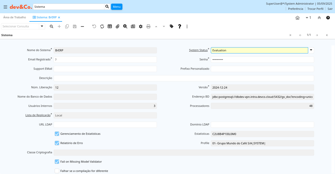 | Data de Expiração (Suporte) | Data em que o suporte ao BrERP irá expirar | Visite https://www.devcoffee.com.br para opções de suporte | ad_system.SupportExpDate timestamp without time zone Date |
