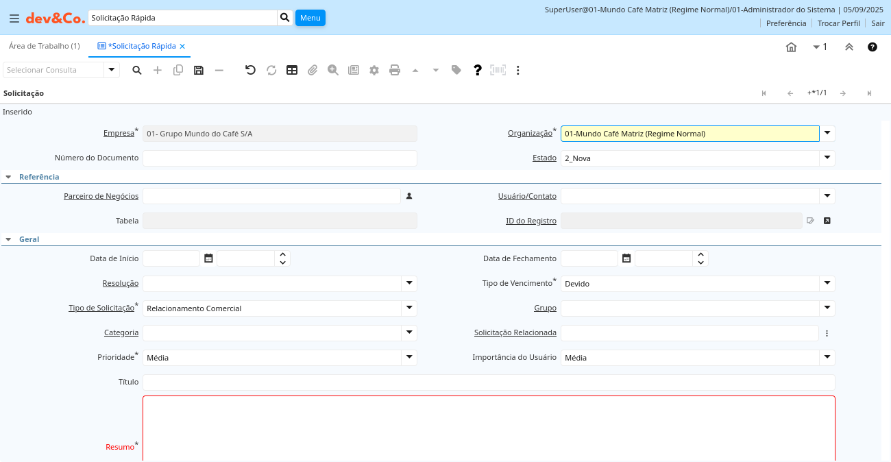 | Resumo | Resumo textual desta solicitação | O "Resumo" permite a digitação de um texto de formatação livre sobre a recapitulação desta solicitação. | r_request.Summary character varying(2000) Text |
