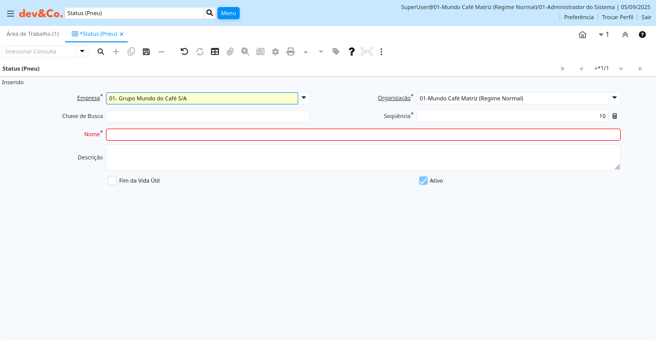 | Chave de Busca | Chave de pesquisa para o registro no formato necessário - tem que ser único e exclusivo | Uma "Chave de Busca" fornece a você um método rápido de encontrar um registro em particular. Se você deixar a chave de busca vazia, o sistema automaticamente cria um valor numérico. A seqüência de documento usada por este número de recuperação é definida na janela "Gerenciamento de Seqüência" com o nome "DocumentNo_", onde TableName é o nome real da tabela (ex: C_Order). | cof_pneu_status.Value character varying(40) String |