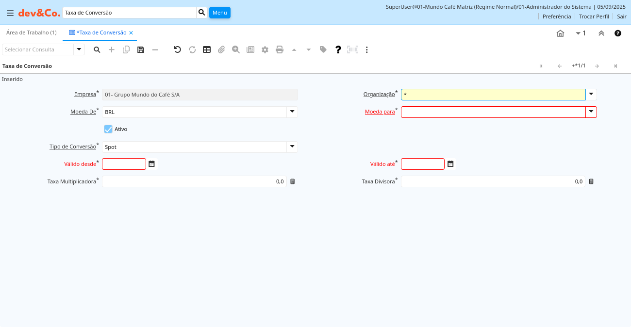 Ajuda: A Aba "Taxa de Conversão" é usada para definir as taxas de conversão a serem usadas ao converter montantes de documentos de uma moeda para outra Taxas de conversão podem ser definidas para múltiplos tipos de taxas. Elas também podem ser efetivas para uma determinada faixa de datas. Note que somente a taxa de multiplicação é utilizada; A taxa de divisão é somente para visualização.