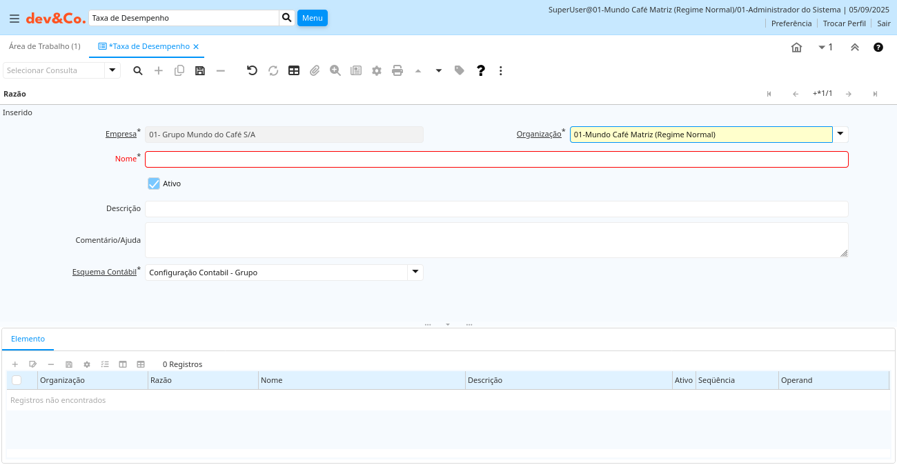 | Razão | Performace Ratio | Calculation instruction set for a perfomance ratio | pa_ratioelement.PA_Ratio_ID numeric(10) Table Direct |