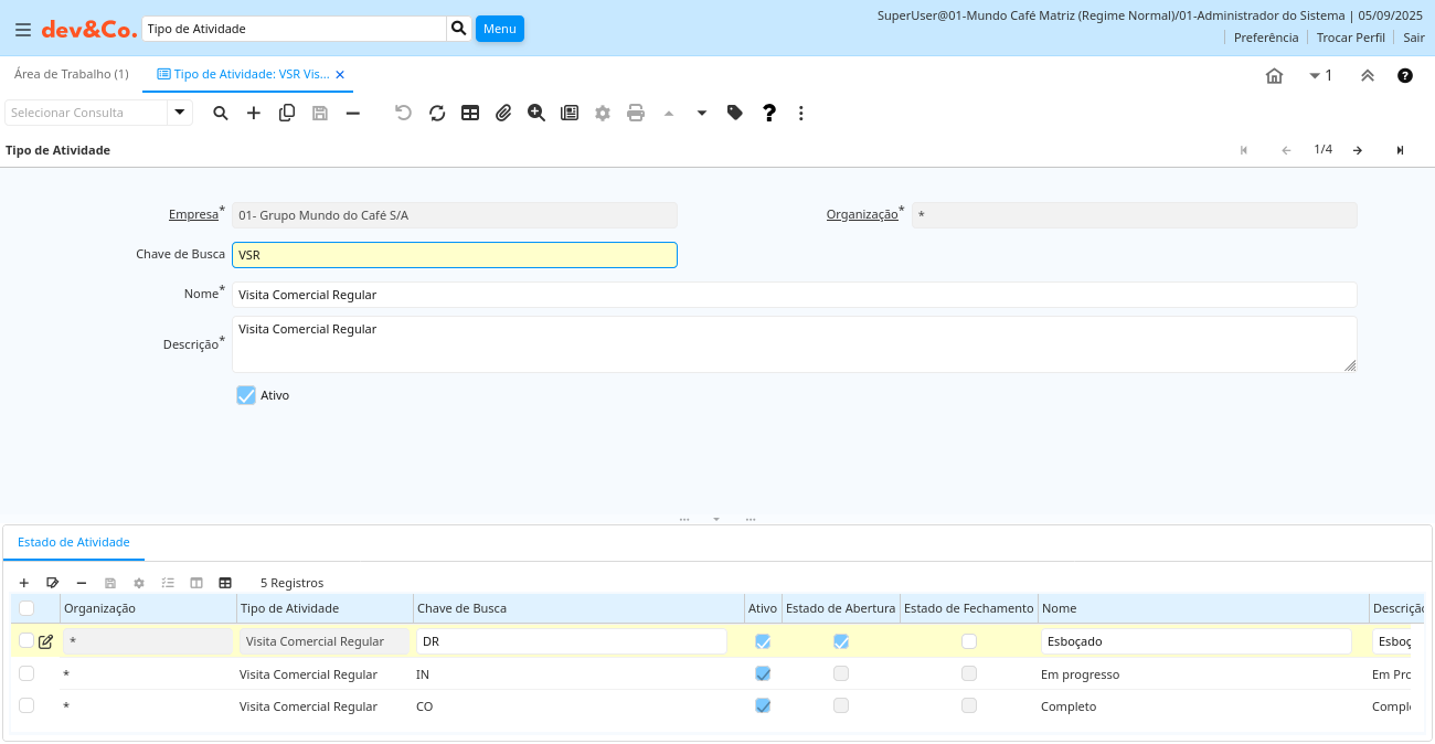| Chave de Busca | Chave de pesquisa para o registro no formato necessário - tem que ser único e exclusivo | Uma "Chave de Busca" fornece a você um método rápido de encontrar um registro em particular. Se você deixar a chave de busca vazia, o sistema automaticamente cria um valor numérico. A seqüência de documento usada por este número de recuperação é definida na janela "Gerenciamento de Seqüência" com o nome "DocumentNo_", onde TableName é o nome real da tabela (ex: C_Order). | cof_activity_type.Value character varying(40) String |