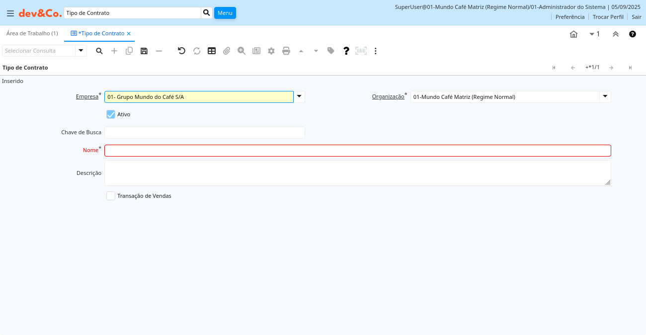 | Chave de Busca | Chave de pesquisa para o registro no formato necessário - tem que ser único e exclusivo | Uma "Chave de Busca" fornece a você um método rápido de encontrar um registro em particular. Se você deixar a chave de busca vazia, o sistema automaticamente cria um valor numérico. A seqüência de documento usada por este número de recuperação é definida na janela "Gerenciamento de Seqüência" com o nome "DocumentNo_", onde TableName é o nome real da tabela (ex: C_Order). | cof_contractcategory.Value character varying(40) String |