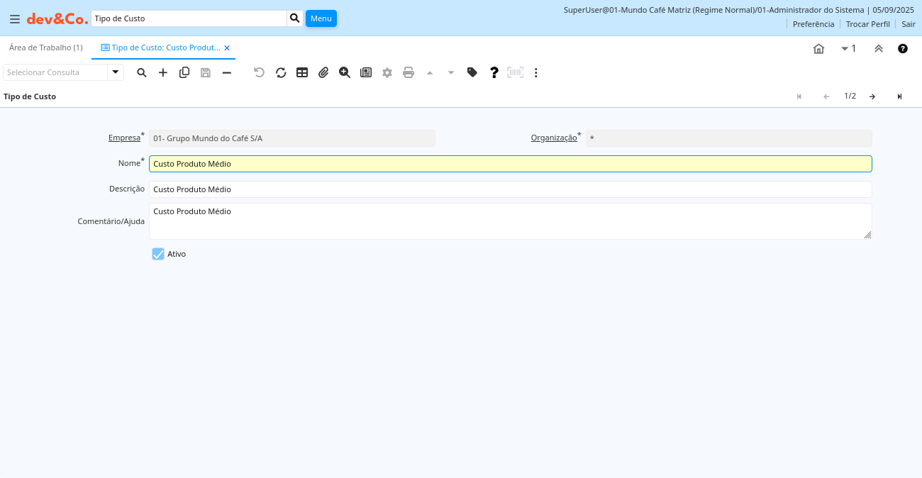Ajuda: Você pode definir múltiplos tipos de custos. O tipo de custo selecionado em um "Esquema Contábil" é utilizada para a Contabilidade.