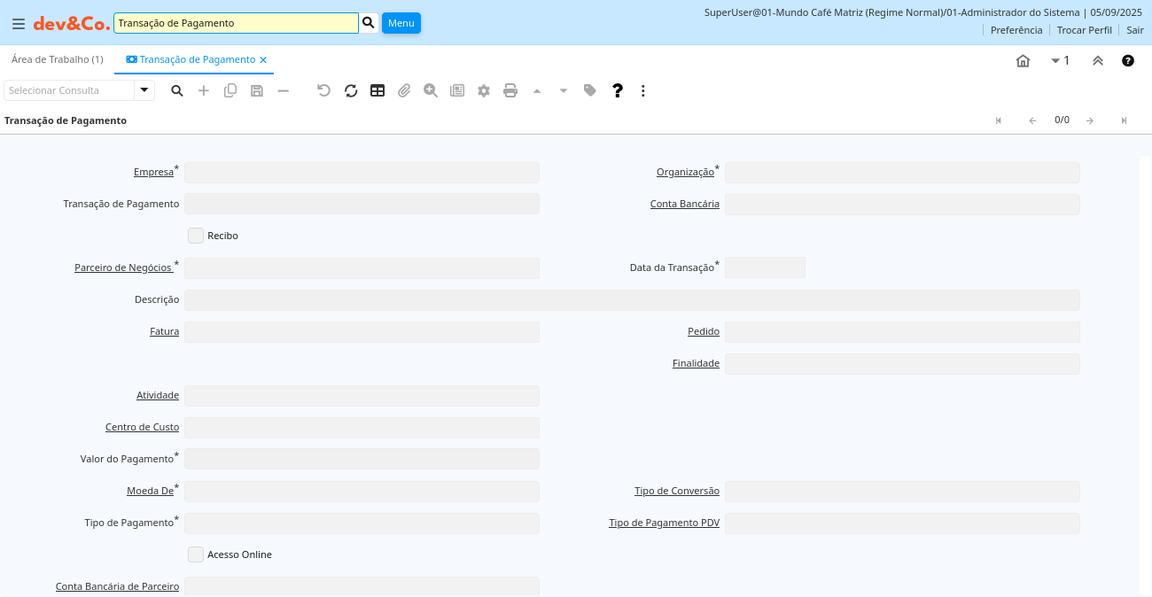 | Referência Operação de Pagamento | c_paymenttransaction.Ref_PaymentTransaction_ID numeric(10) Search | ||