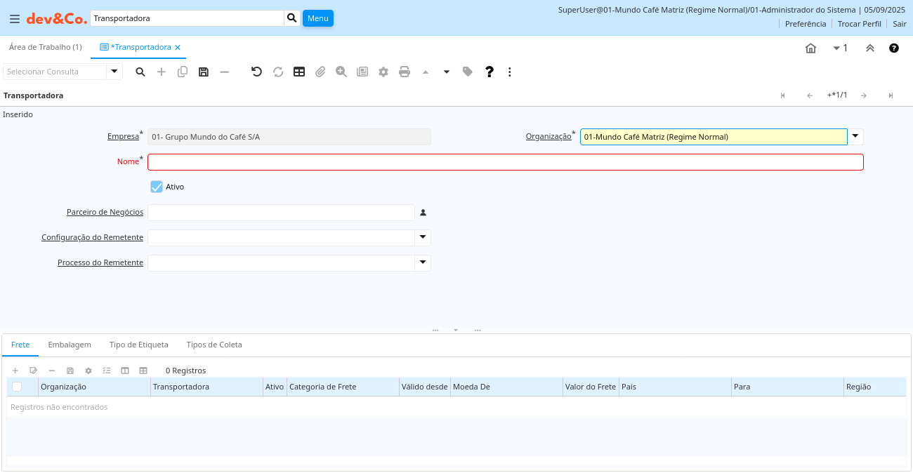 Ajuda: A Janela "Transportadora" define as diferentes formas de transporte utilizados por uma organização. Uma Transportadora predefinida tem que ser selecionada quando um método de entrega de uma Transportadora for usado em um Pedido.