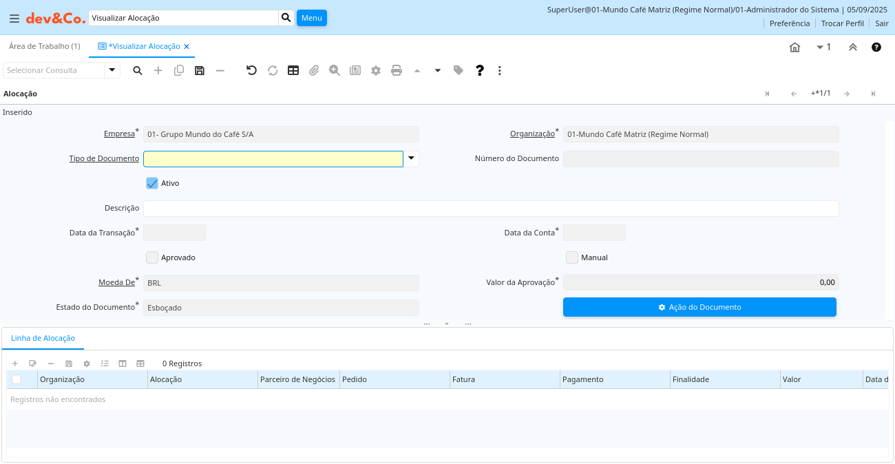 | Estado do Documento | O estado atual do documento | O "Estado do Documento" indica o estado de um documento neste momento. Se você deseja alterar o Estado do Documento, use o campo "Ação do Documento" | c_allocationhdr.DocStatus character(2) List |