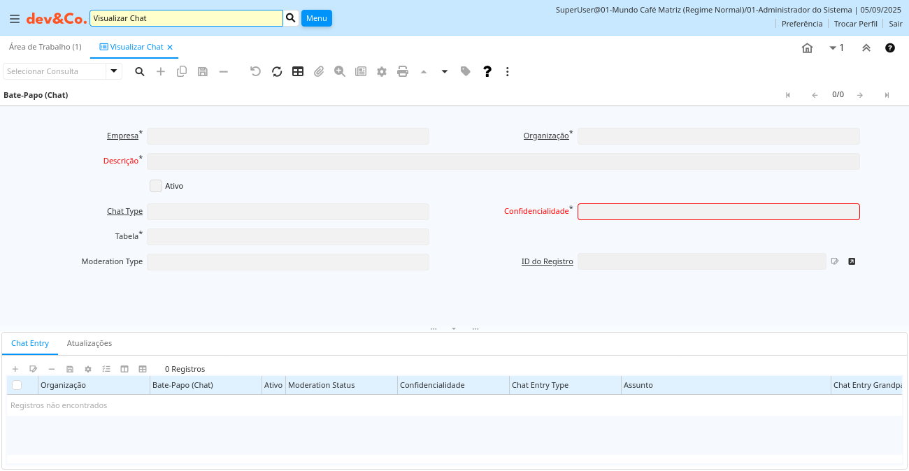 | Ativo | O registro está ativo no sistema | Existem dois métodos de tornar um registro indisponível no sistema: O primeiro é excluir o registro, o outro é desativar o registro. Um registro desativado não está disponível para seleção, mas está disponível para relatórios. Existem duas razões para desativar um registro ao invés de excluí-lo: (1) O sistema exige o registro para fins de auditoria. (2) O registro é referenciado por outros registros. Ex. você não pode excluir um Parceiro de Negócios, se existirem faturas para este parceiro de negócios. Você desativa o Parceiro de Negócios e previne que este registro seja usado para entradas futuras. | cm_chatentry.IsActive character(1) Yes-No |