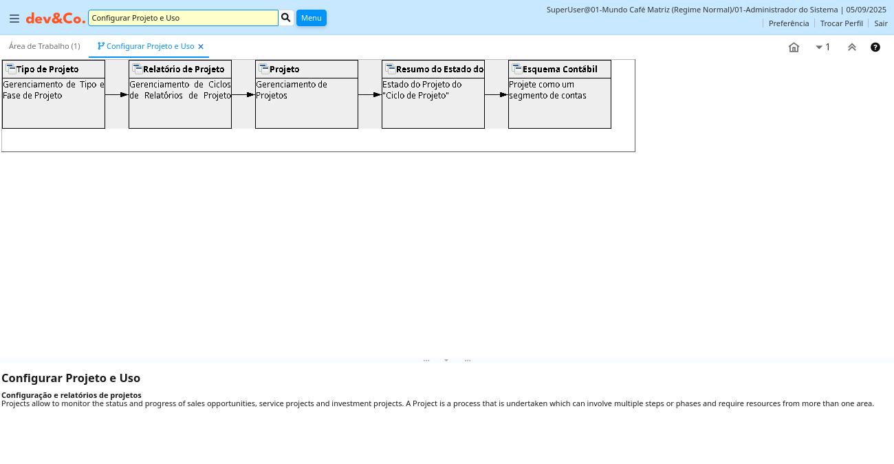 Ajuda: Projects allow to monitor the status and progress of sales opportunities, service projects and investment projects. A Project is a process that is undertaken which can involve multiple steps or phases and require resources from more than one area.
