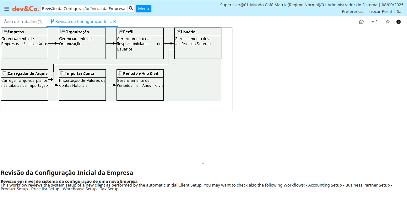 Ajuda: This workflow reviews the system setup of a new client as performed by the automatic Initial Client Setup.