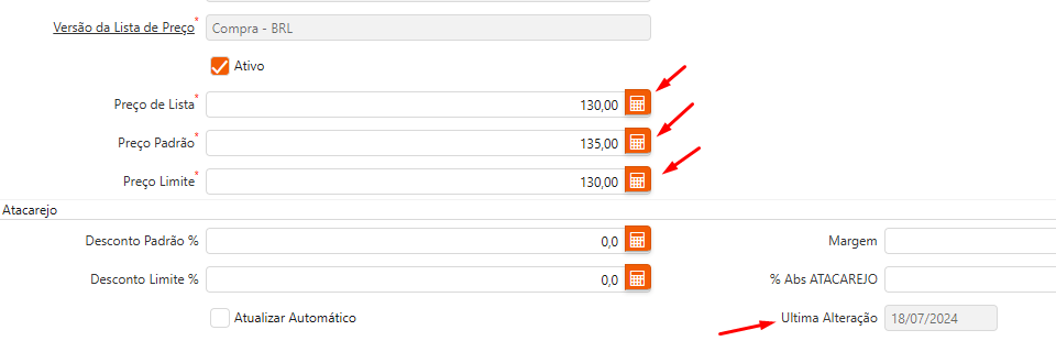 Sempre que um dos campos de preço (Preço de Lista, Preço Padrão e Preço Limite) sofrerem alteração, irá preencher o campo ‘Última Atualização’ com a data em que foi alterado.