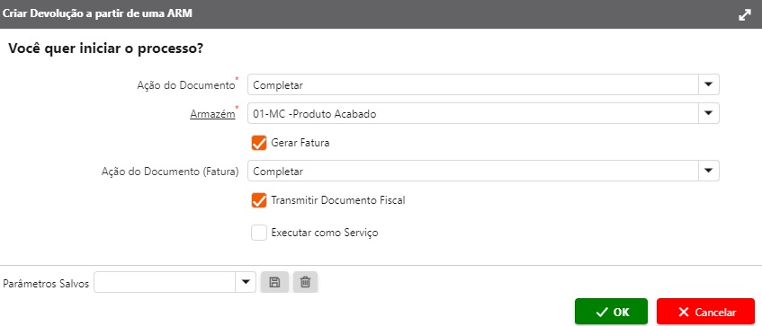 Após completar a Autorização de Devolução de Material (ARM), clique no processo Criar Devolução a partir de uma ARM, selecione a Ação do Documento como Completar, assim irá apresentar a flag Gerar Fatura.