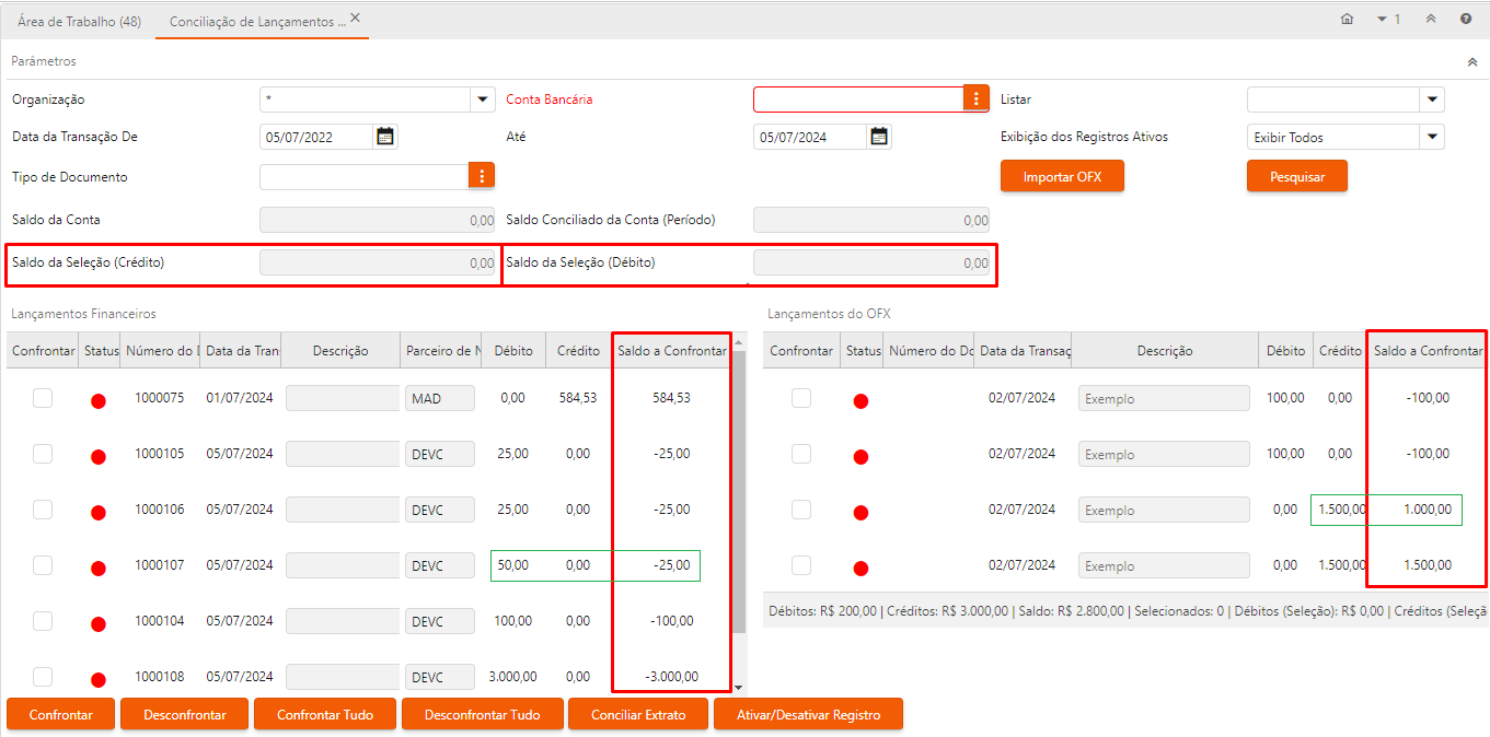 Os totalizadores “Saldo da Seleção (Crédito)” e “Saldo da Seleção (Débito)” foram criados no formulário. Eles apresentam o saldo dos registros selecionados pelo usuário que ainda não foram conciliados.