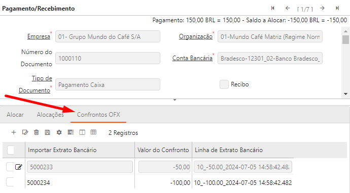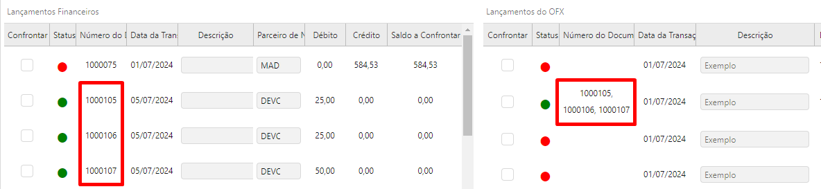Ao confrontar, no cenário de muitos para muitos, irá popular a aba com o valor dos lançamentos financeiros selecionados, até que o valor do OFX seja atingido. Caso um lançamento OFX não consuma 100% do valor de um lançamento financeiro, o resto desse valor será alocado no próximo OFX selecionado.