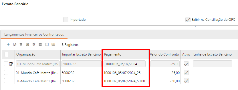 O campo “Pagamentos” da janela “Importar Extrato Bancário” foi excluído. Seus dados foram migrados para a aba “Confrontos OFX”.