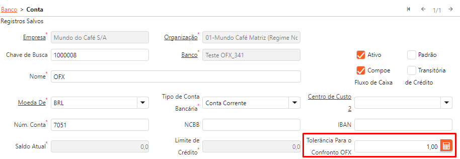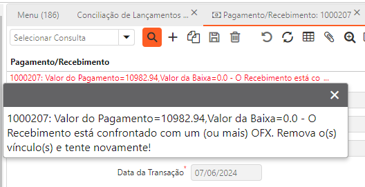 Se a soma dos registros na sub-aba não for igual ao saldo do lançamento OFX (considerando a tolerância informada no campo “Tolerância Para o Confronto OFX” da janela “Banco > Conta”), não será permitido realizar o confronto dos lançamentos.