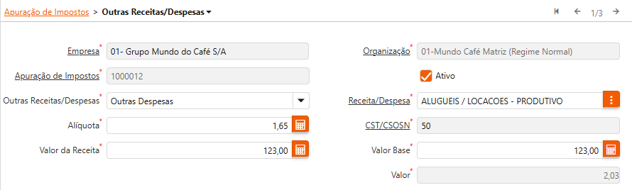 Tipo = Outras Despesas. - Qualquer alteração em "Valor Base" ou "Alíquota" serão recalculados automaticamente os valores no cabeçalho.