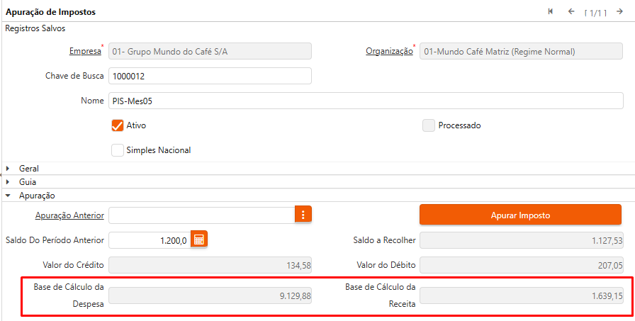 - Base de Cálculo: Soma do campo Valor Base da aba Saídas da janela Apuração de Impostos quando o CST do lançamento for 05 e o produto for produzido;