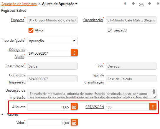 - Quando for criado um registro de "Ajuste de Apuração" com