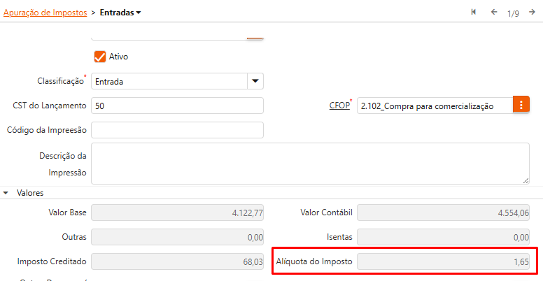 Para os campos "Entrada Documentos Fiscais(+)" e "Saídas (devoluções) (-)", deve checar a alíquota através do campo "Alíquota do Imposto", presentes nas abas Entradas e Saídas da apuração. Para o campo "Outros Créditos", checa a alíquota informada no campo "Alíquota" da aba Outras Receitas/Despesas.