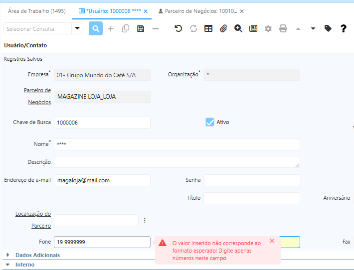 Implementamos uma nova validação nos campos de telefone. A partir de agora, os campos de telefone nas telas de "Usuário" e "Localização do Parceiro de Negócios" aceitarão somente a inserção de caracteres numéricos.