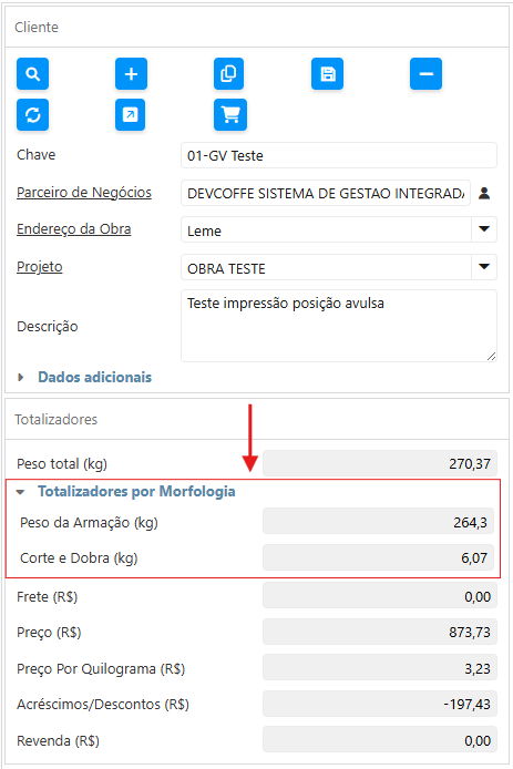 O peso do arame utilizado para armação não é considerado no cálculo dos campos Peso total (kg) e Revenda (R$).