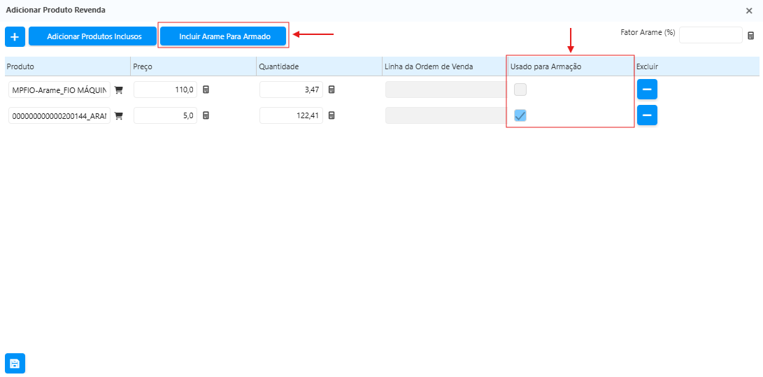 O botão "Incluir arame" foi renomeado para Incluir Arame Para Armado e foi criada a flag Usado para Armação na janela de Produtos Revenda, para identificar os produtos que devem ser considerados como arame de armação.