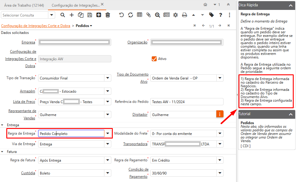 | % Tolerância de Entrega | Decisão do usuário. | O valor informado neste campo será utilizado na integração para permitir divergências, conforme o valor informado neste campo. |