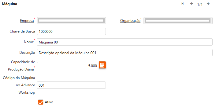 | Código da Máquina no Advance Workshop | Código da máquina no AW. | Informação utilizada para criar registros na aba “Histórico de Uso” da janela. |