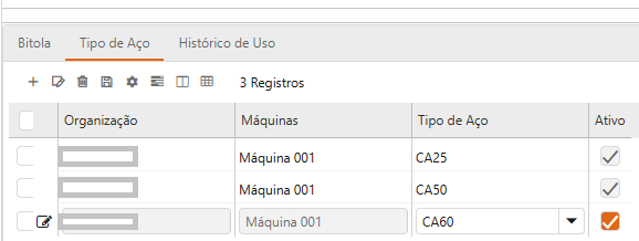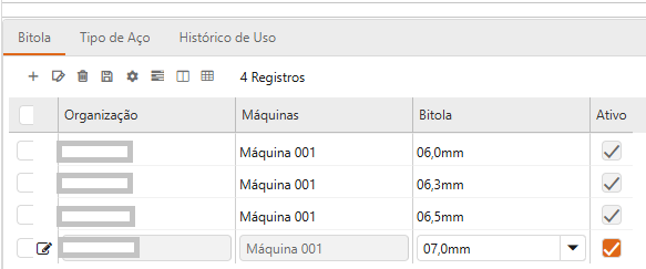 Além da máquina, deve-se configurar quais são as bitolas e tipos de aço suportados por ela. Para tanto, basta criar os registros nas abas “Bitola” e “Tipo de Aço”. As figuras a seguir ilustram um exemplo de configuração para esta janela.